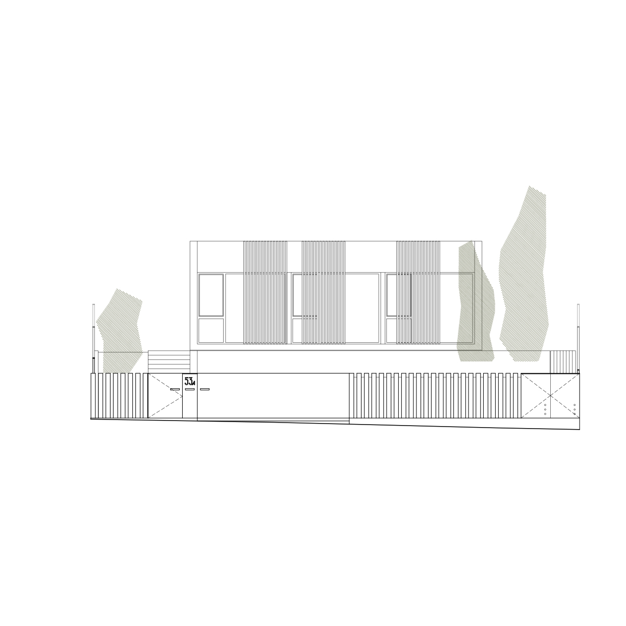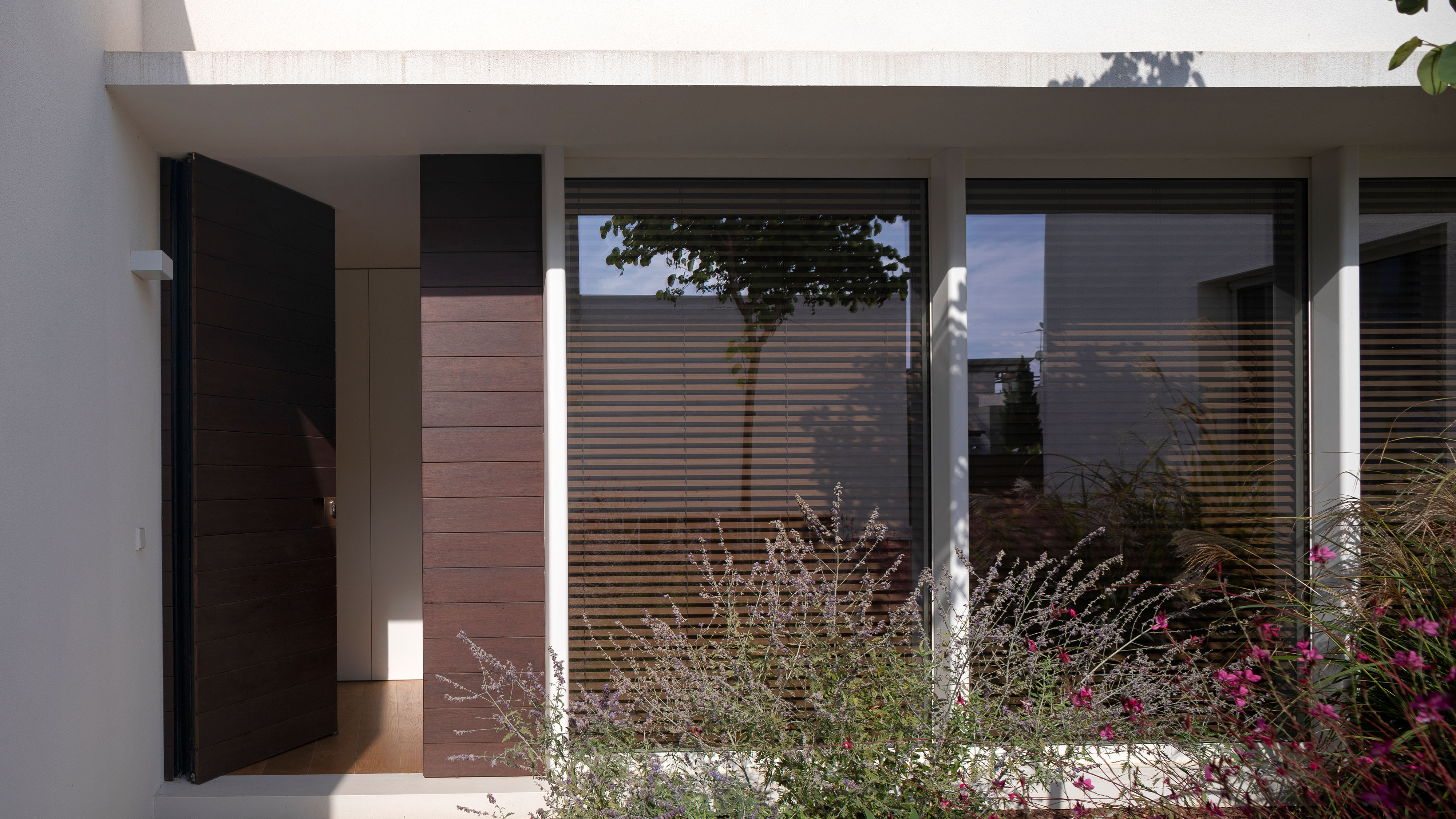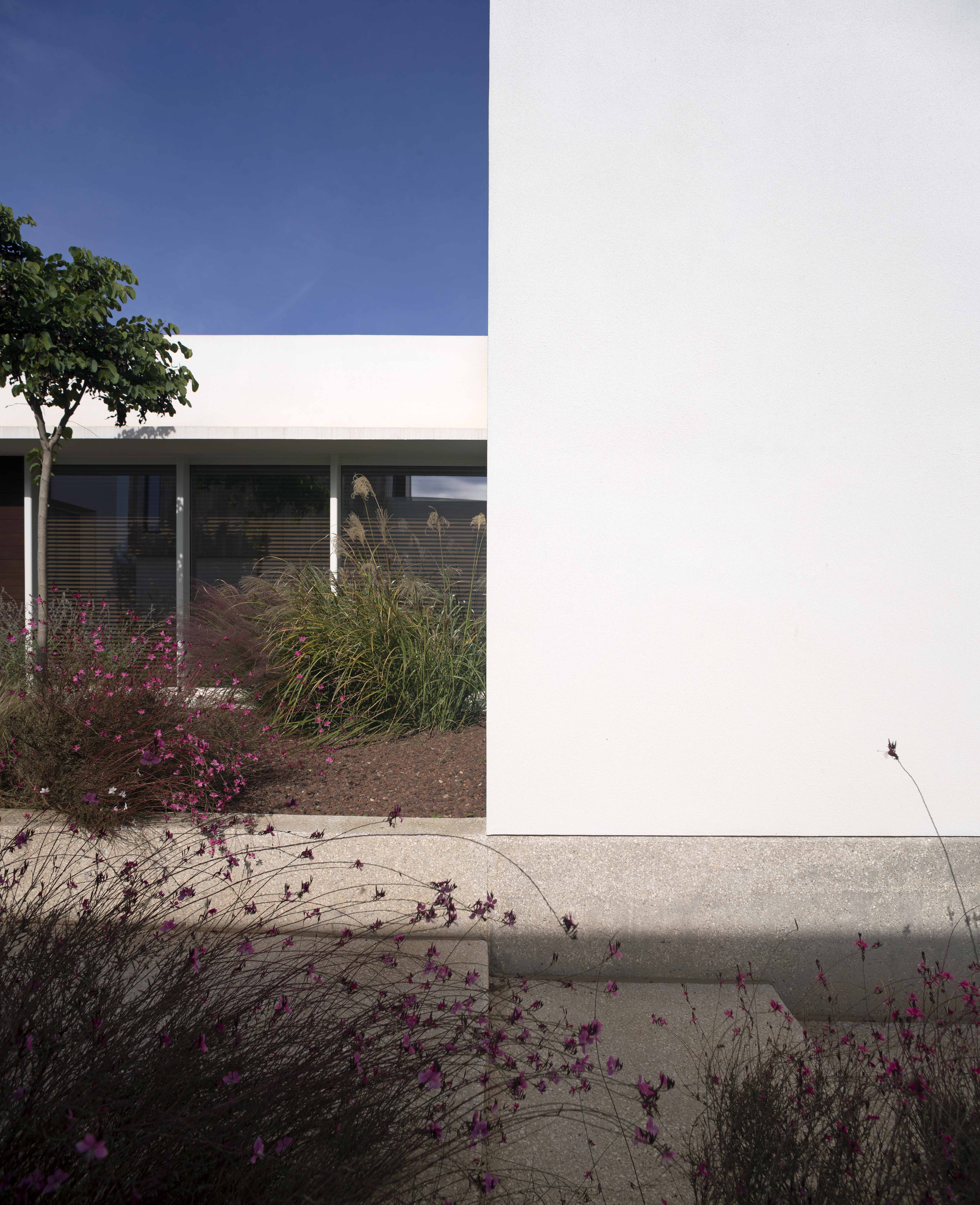 Desde el punto de vista constructivo, la vivienda se articula mediante dos sistemas materiales que reflejan su organización funcional. La planta semienterrada, que alberga el garaje, instalaciones y zonas de servicio, se resuelve con hormigón visto, anclando visual y estructuralmente la vivienda al terreno. Sobre este basamento se eleva el volumen principal, destinado a la vida diurna, con una envolvente continua de acabado blanco. Este revestimiento, más abstracto y liviano, acentúa los juegos de luz y sombra proyectados por porches, celosías y elementos de control solar, aportando profundidad, movimiento y carácter a la composición.