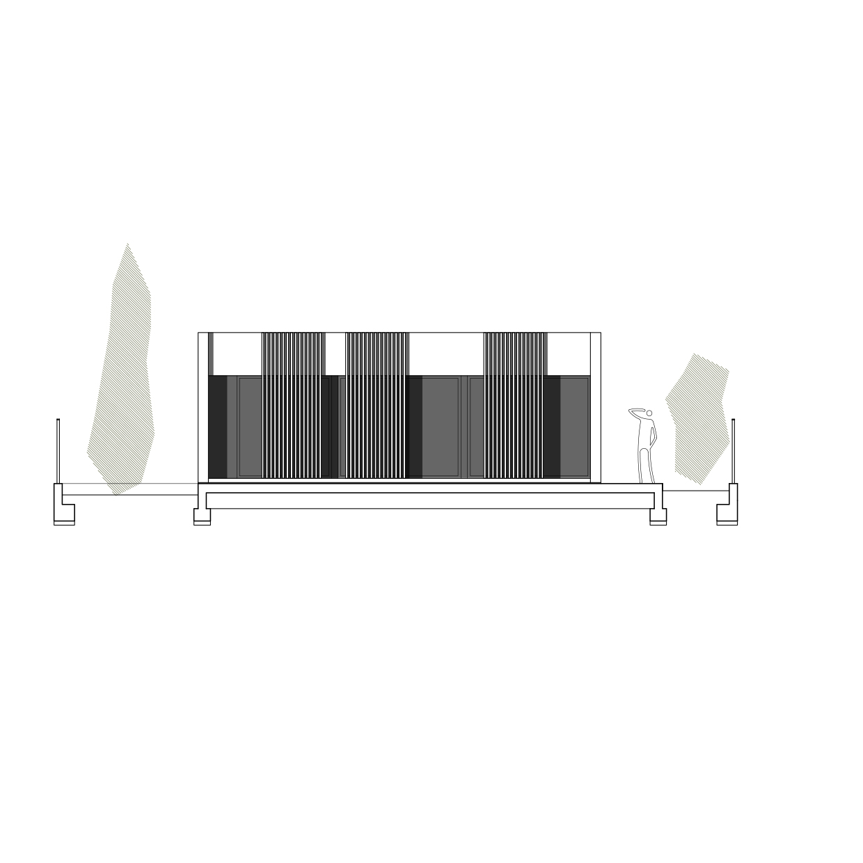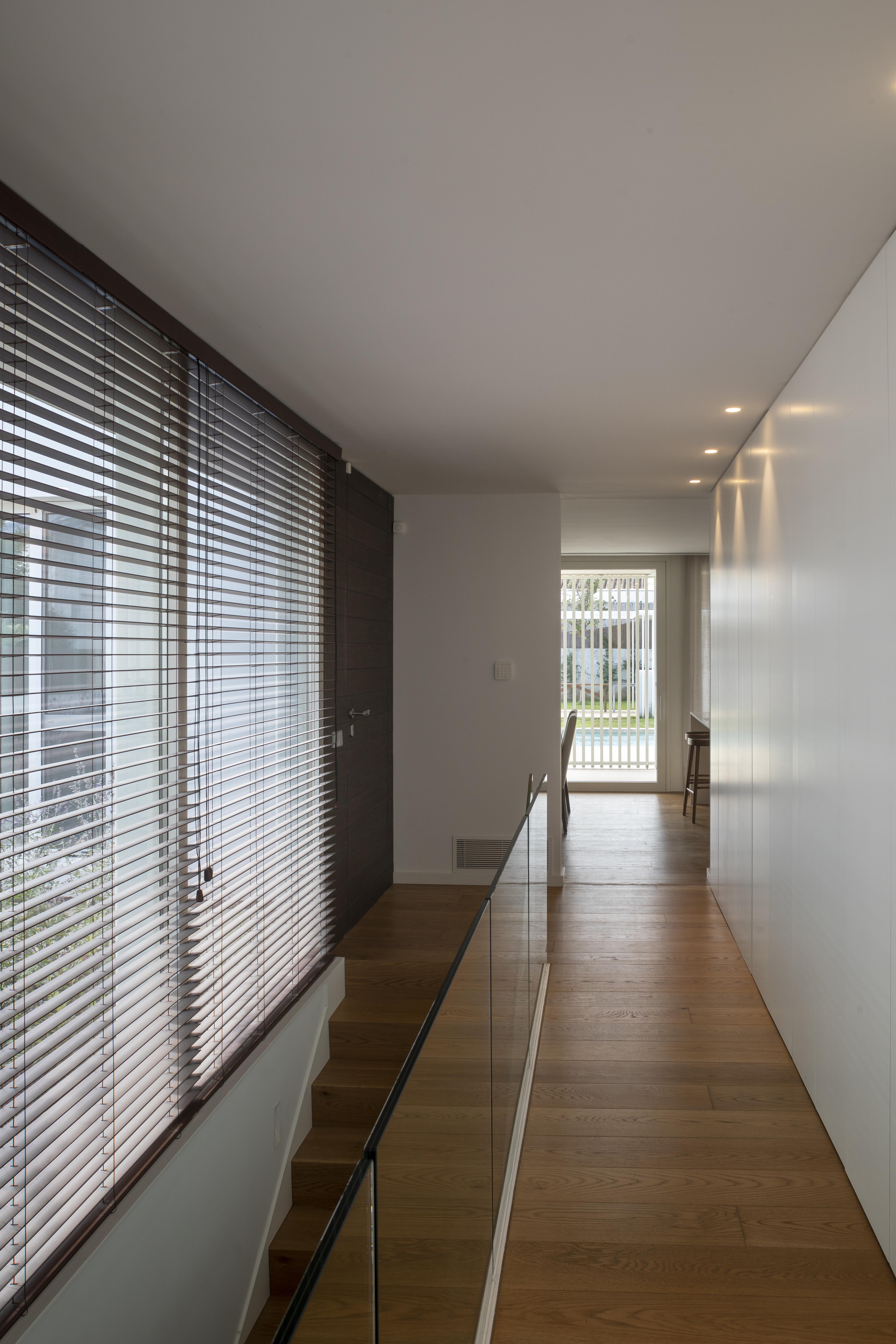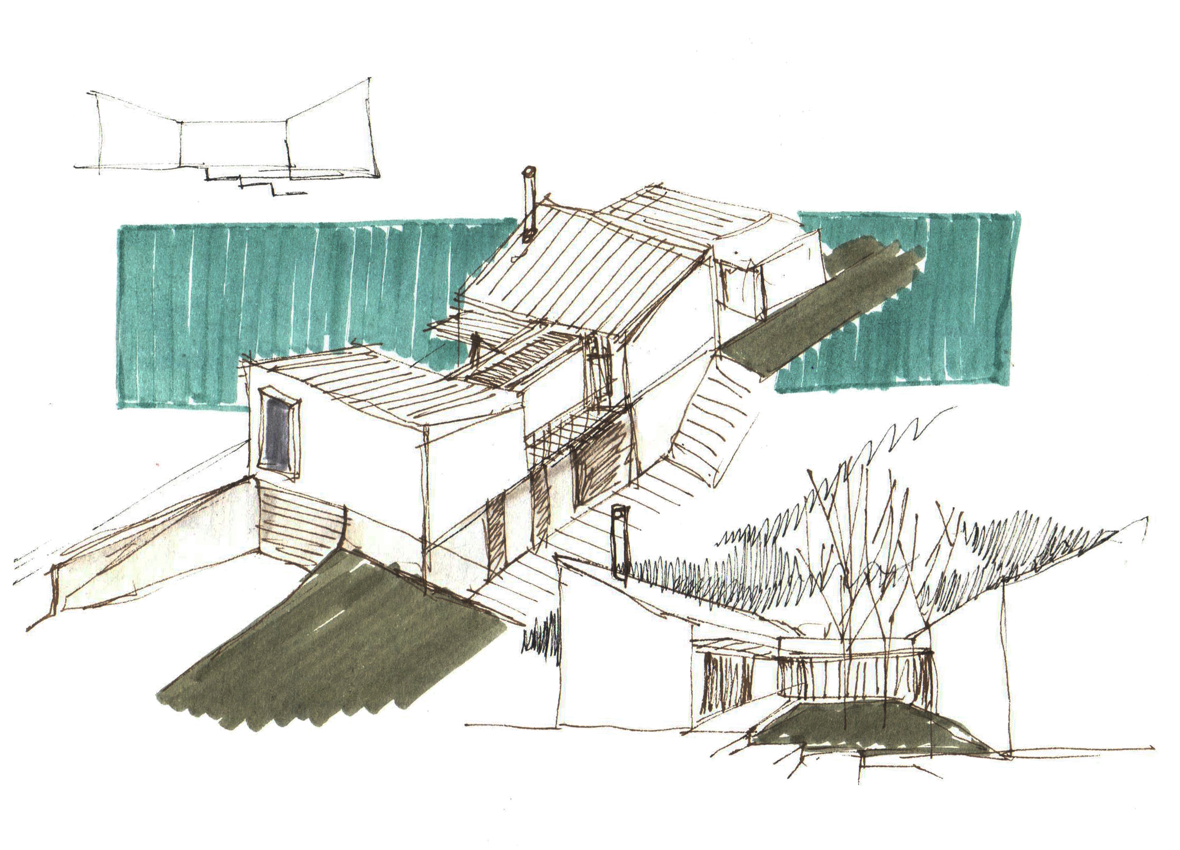 Desde el punto de vista constructivo, la vivienda se articula mediante dos sistemas materiales que reflejan su organización funcional. La planta semienterrada, que alberga el garaje, instalaciones y zonas de servicio, se resuelve con hormigón visto, anclando visual y estructuralmente la vivienda al terreno. Sobre este basamento se eleva el volumen principal, destinado a la vida diurna, con una envolvente continua de acabado blanco. Este revestimiento, más abstracto y liviano, acentúa los juegos de luz y sombra proyectados por porches, celosías y elementos de control solar, aportando profundidad, movimiento y carácter a la composición.