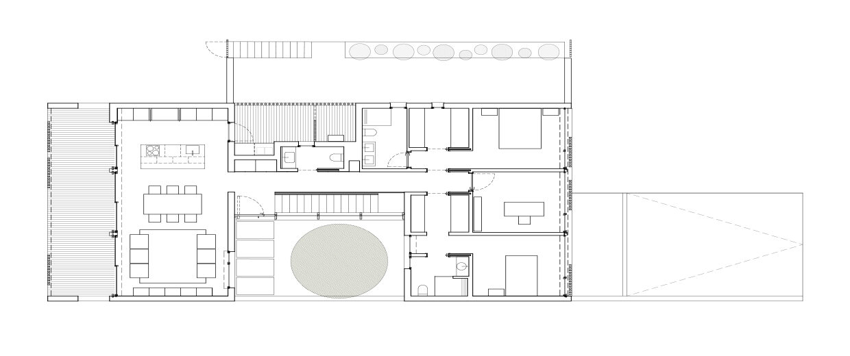 Optamos por una organización en pabellones dispuestos perpendicularmente al eje longitudinal de la parcela. Esta estrategia permitió abrir patios intermedios que actúan como filtros espaciales y lumínicos, generando una secuencia fluida entre los volúmenes habitables. Estos patios no solo garantizan iluminación natural cruzada, sino que ofrecen conexiones diagonales —visuales y físicas— que amplifican la percepción del espacio, diluyendo los límites entre interior y exterior.